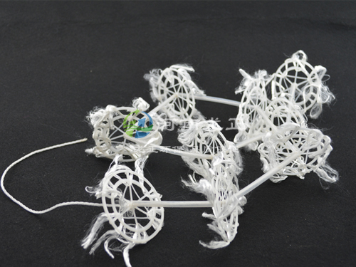 【結(jié)構(gòu)】是將塑料圓片壓扣改成雙圈大塑料環(huán),將醛化纖維或滌綸絲壓在環(huán)的環(huán)圈上,使纖維束均勻分布;內(nèi)圈是雪花狀塑料枝條,既能掛膜,又能有效切割氣泡,提高氧的轉(zhuǎn)移速率和利用率。使水氣生物膜得到充分交換,使水中的有機(jī)物得到高效處理。